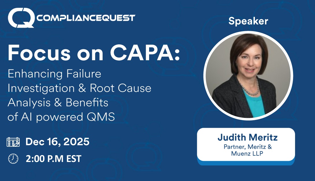 Proper investigation and root cause analysis are key to achieving positive outcomes. Too often, CAPA actions fail to prevent problems from recurring, and failure investigations don’t accurately define the issue. Gain valuable insights into how to apply failure investigation techniques to identify true root causes and develop effective corrective actions. Acquire the skills needed to ensure systematic investigation of discrepancies as the pathway to preventing recurrence.Applying AI to root cause analysis within the CAPA process offers significant benefits by streamlining workflows and shifting the focus from a reactive approach to a proactive, data-driven one.AI-powered QMS platforms, such as the ComplianceQuest CAPA Module, leverage advanced automation, predictive analytics, and real-time data to detect potential quality issues early, pinpoint the right problems to solve, and ensure effective action plans.